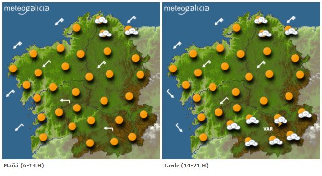 Con esta situación, haberá ceos despexados en xeral, excepto no norte de Lugo, onde haberá intervalos de nubes baixas. Xa pola tarde, crecerán as nubes de evolución en zonas de interior.