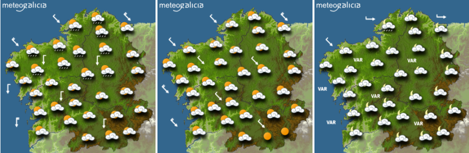 A Coruña 15° 20°; Ferrol 14° 21°; Lugo 11° 21°; Ourense 13° 25°; Pontevedra 10° 22°; Santiago 12° 21°; Vigo 12° 22°.