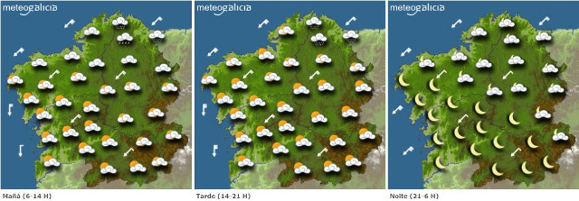 Así as cousas, nun día de ventos moderados —con intervalos fortes no litoral—, Meteogalicia apunta que as temperaturas mínimas non experimentarán cambios relevantes. As máximas elevaranse en boa parte da comunidade, ata os 24 graos en Pontevedra e Vigo. Lugo, con todo, quedará nos 15.