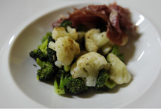 Como muestra de esa fusión y con las verduras y hortalizas recién entregadas por Santiago Pérez, Jaume García preparó un plato de brécol con coliflor y jamón, una tosta de verduras y hortalizas con queso de cabra y un plato de colas de rape con verduras, sepia, berberechos y setas.