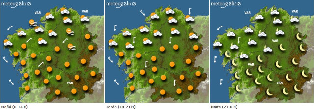 En canto aos termómetros, as temperaturas máis altas do mapa urbano estarán entre os 32 de Ourense e os 20 da Coruña. As mínimas oscilarán entre os 12 de Lugo e os 16 de Pontevedra.