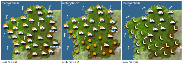 Con esta situación, na xornada de mañá os ceos alternarán nubes e claros, con chuvascos pola mañá máis probables no norte e no leste, tendendo a desaparecer pola tarde.