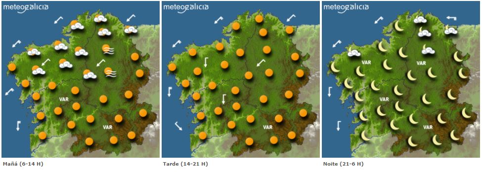 Desta forma agárdase unha xornada con ceos lixeiramente nubrados ou despexados, con presenza de algo de neblina matutina nos vales do interior e nuboeiros de estancamento nas comarcas cantábricas ao principio e ao final.