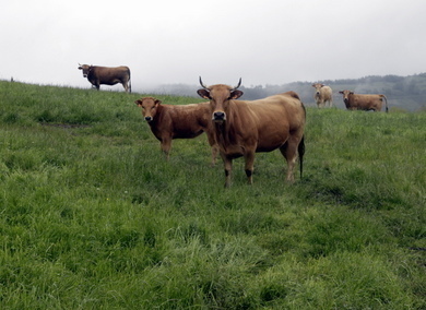 «Se comemos carne das vacas que pastan por aquí, xa vale a pena a viaxe», comentamos en la subida hacia el solitario restaurante. La ilusión se hace realidad. El caserío cuenta con una amplia explotación dedicada a la cría de terneros, cerdos celtas, pollos y conejos de forma totalmente ecológica.
