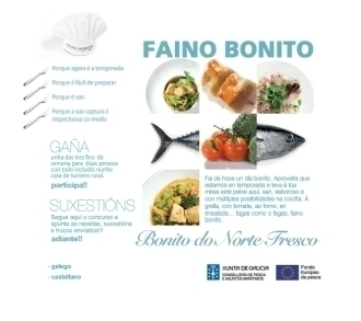 La Consellería de Pesca está desarrollando una campaña de promoción para el bonito del norte que tiene como lema 'Faino bonito'. Esta actuación supondrá actividades promocionales en los mercados gallegos, anuncios en prensa y en radio, folletos y carteles dirigidos a los restauradores de nuestra comunidad, y una página web (www.fainobonito.com) en la que se incluye un concurso en el que se premiarán las mejores recetas o trucos con este pescado cómo protagonista.