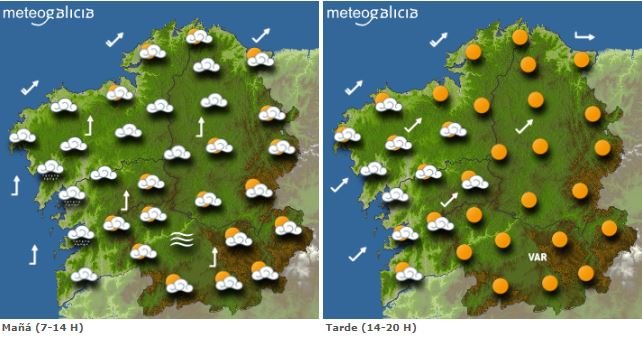 A Coruña 10° 16°, Ferrol 11° 16°, Lugo 8° 15°, Ourense 9° 18°, Pontevedra 12° 16°, Santiago de Compostela 11° 13° e Vigo 12° 16°.
