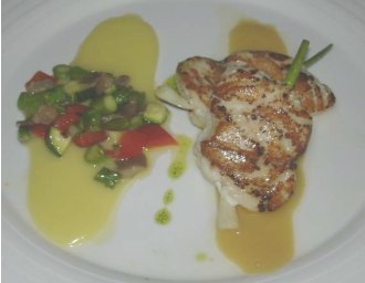 En el fondo del plato ponemos dos cordones; uno de puré de patata (encima colocamos las verduras) y otro de infusión de setas, colmado con dos medallones de rape.