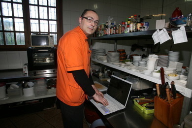 Echalecu, durante un envío de recetas desde su ordenador, en la cocina de El Celler de Monforte (Foto: TOÑO PARGA)