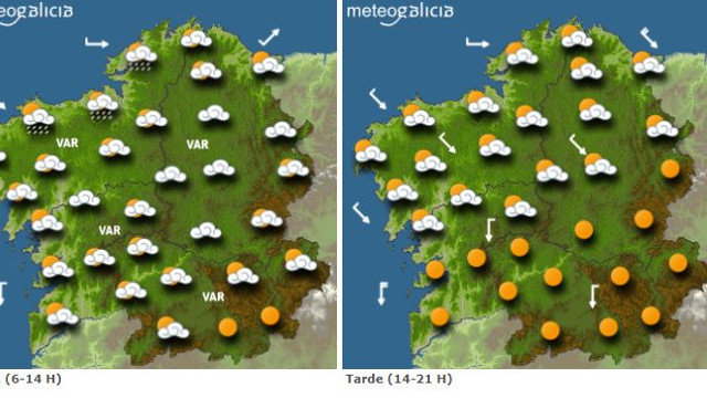 En canto aos valores mínimos, situaranse en 9 graos na cidade das Burgas, 10 graos na capital lucense, 11º en Pontevedra ou Vigo e 13º na Coruña.