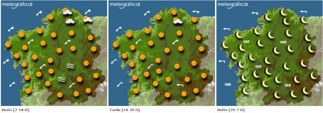 Vento do leste, frouxo no interior e localmente forte no litoral norte pola mañá, amainando a frouxo variable salvo no terzo norte.