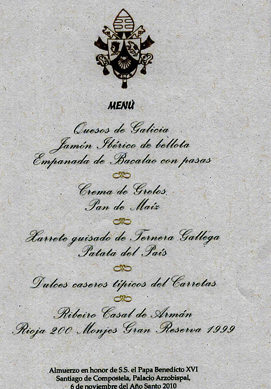 El exclusivo visitante de Santiago de Compostela, Josep Alois Ratzinger llegó a la capital gallega bajo el título de Papa Benedicto XVI a comienzos de noviembre y en una comida también exclusiva celebrada en el Palacio Arzobispal y servida por el restaurante San Clemente, comió quesos gallegos, crema de grelos, pan de maíz, jarrete guisado de ternera gallega y patata del país y bebió, igual que su séquito, un Rioja "Monjes Gran Reserva" y el Ribeiro "Casal de Armán", elaborado con la variedad "treixadura" también para acompañar los postres caseros típicos del restaurante "Carretas".