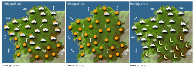 Principais indicadores das temperaturas: A Coruña 14° 21°; Ferrol 14° 22°; Lugo 14° 26°; Ourense 14° 31°; Pontevedra 13° 28°; Santiago 13° 23°; Vigo 12° 26°.