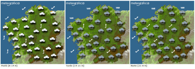Así, os ceos estarán cubertos con choivas que comezarán pola mañá na metade oeste e a partir do mediodía chegarán a toda a comunidade e deixarán acumulados importantes ao final da xornada.