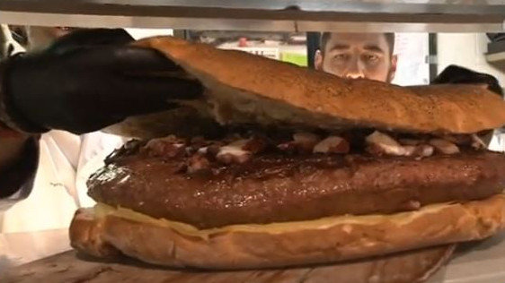 Treinta kilos de carne Ternera Gallega, pulpo, queso San Simón da Costa y pan ecológico son los ingredientes principales de esta macrohamburguesa denominada Gallega, según contaron los responsables del establecimiento a la TVG.