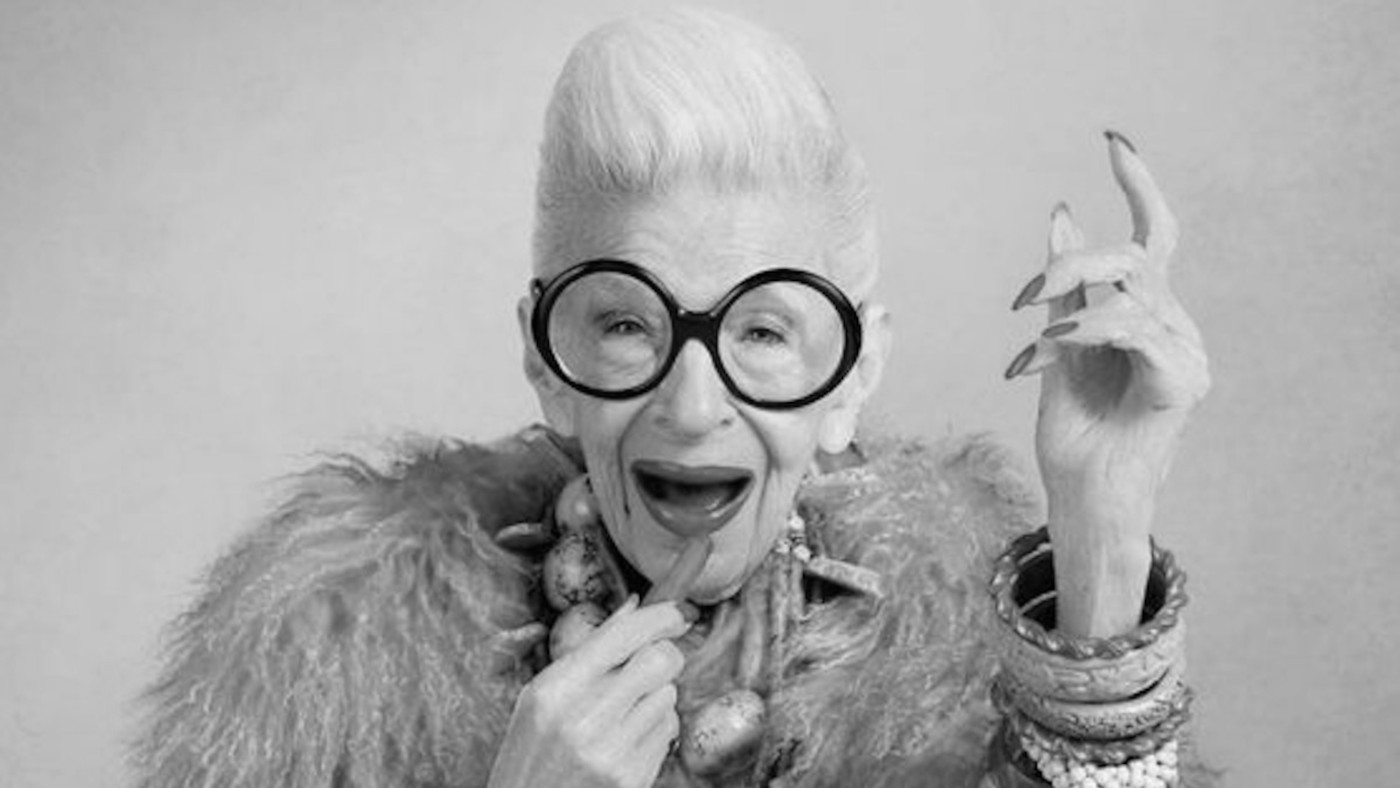 Unas gafas redondas de pasta negra enmarcan su rostro repleto de pliegues lógicos. La edad escribe su propia historia en la piel de cada cual. Los ojos azules siguen conservando una mirada astuta no cubierta aún por el velo de la antigüedad y nada parece difuminar el brillo auténtico. La sombra de ojos se alarga como un gesto exagerado y chillón, que a ella le aporta el carácter que debe poseer toda figura icónica. Los labios rojos, las uñas rojas. El pelo blanco, de corte moderno, que resulta el contraste perfecto con la rotundidad esférica de los anteojos de montura negra. Los accesorios son llamativos, por la cantidad y el colorido. Pulseras, collares, anillos, grandes, resplandecientes, tendentes a dejar la sobriedad en un rincón. La suelen calificar de extravagante, aunque sigue dando la impresión de saber perfectamente lo que hace. No es una extravagancia loca ni grotesca, sino extraña. Sin embargo, cada vez hay más investigaciones que analizan el fenómeno del envejecimiento asociado a la imagen, al mundo virtual y a una resignificación de la mirada en la sociedad contemporánea. Iris Apfel es elegida para numerosos estudios de caso. El mercado de la ancianidad empieza a tener una base teórica importante.
