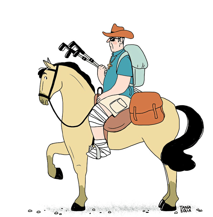 Ni dos semanas pasaron y Teodomiro estaba nuevamente en ruta, esta vez a lomos de un formidable corcel. Hizo todas las etapas felizmente, teniendo mucho cuidado al descabalgar de no caminar más de tres metros apoyado en unas muletas que llevaba atadas a la silla del caballo, como Clint Eastwood llevaba la escopeta. Como jinete con cierta práctica, consiguió hacerse con el caballo en media hora y empezaron a actuar de manera simbiótica. No había comprado un caballo cualquiera, sino uno de raza pura, bien entrenado y que valía un potosí.