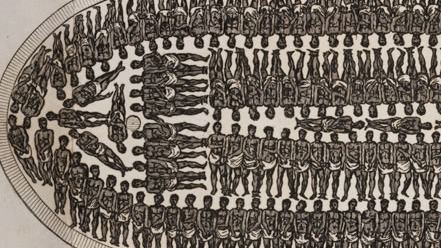Os escravos ían encadeados en parellas, pechados como en lata de sardiña —a portada da edición española está chea de esquemas sobre isto— e estaban cheos de merda pola falla de retretes. Aínda que os alimentasen ben, non por humanidade senón porque o éxito económico da expedición dependía de que sobrevivisen moitos e non se amotinasen, cando nas bodegas entraban a disentería, a varíola ou o escorbuto as consecuencias eran terríbeis. Os mortos guindábanse pola borda sen ningunha cerimonia e ás veces eran tantos que os tiburóns xa non se separaban dos barcos posto que sabían que se os seguían tiñan o xantar asegurado.