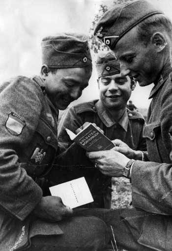 O da axuda é un falar. A División Azul, dirixida polo fachendoso Muñoz Grandes, mantense durante todo o relato lonxe da acción real e mesmo cando trata de cazar partisanos atopa serias dificultades pola falla de equipamento e tácticas axeitadas. Describe con ironía o soldado ruso a incapacidade dos españois para tirar proveito dos seus servizos —a falla de saber ruso ou alemán— e un comportamento que mestura os abusos contra a poboación e unha picaresca literaria, esaxerada sen dúbida pero non carente de base real.