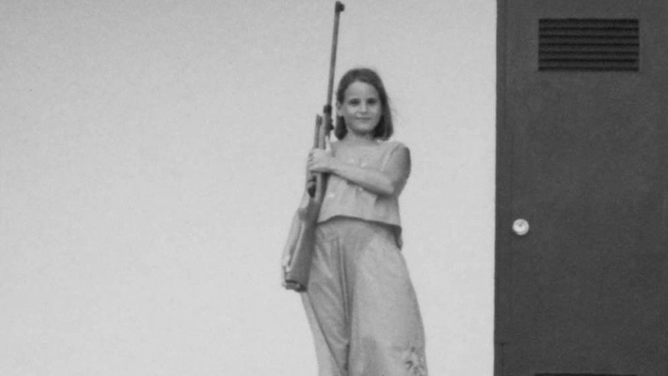 A fotografía impacta dende a cuberta amarela. Nótase que ten tempo: é en cor pero carece da definición do dixital. No centro da imaxe aparece unha nena á que non se lle botan máis de dez ou once anos. Está a carón dunha porta vermella e diante dunha parede branca, ideal como fondo fotográfico. Leva sandalias de cor branco e un conxunto vaporoso de cor salmón que deixa ver as canelas. A súa faciana é un oval perfecto enmarcado por unha media melena e debuxa un medio sorriso dentro dun aceno serio. Está en posición de firmes. Coa man dereita sostén a culata dun fusil. O brazo esquerdo cruza por diante do peito para agarrar o corpo da arma.